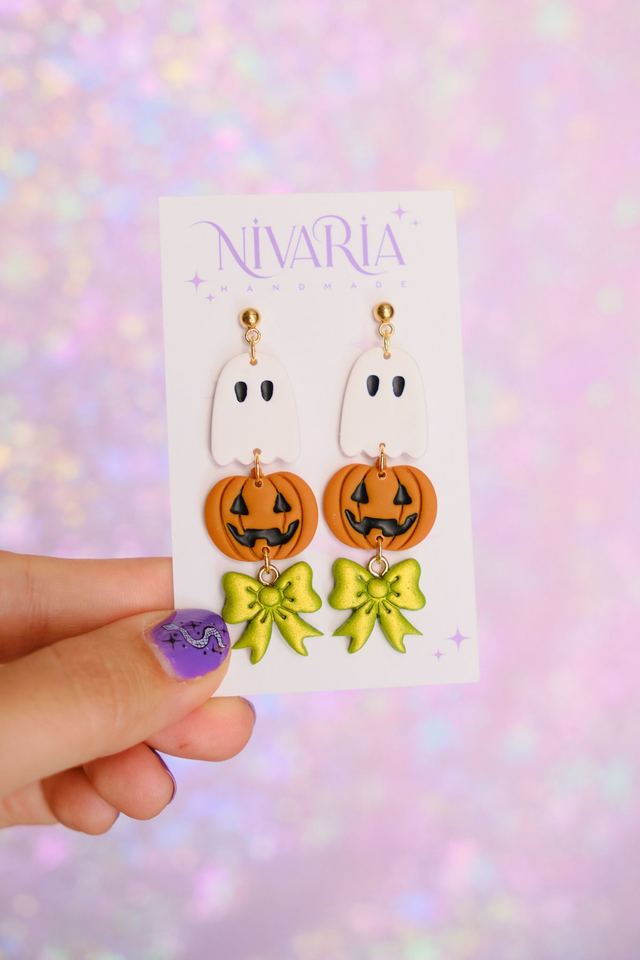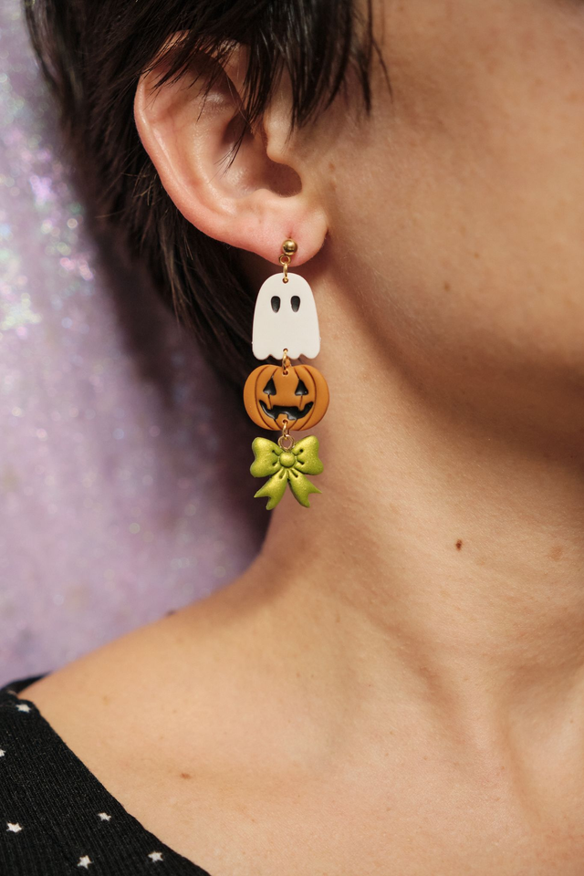 Pendientes de trío de charms de la Colección Halloween.♥ Con un fantasmita, una calavera y un lazo verde brillante.✶