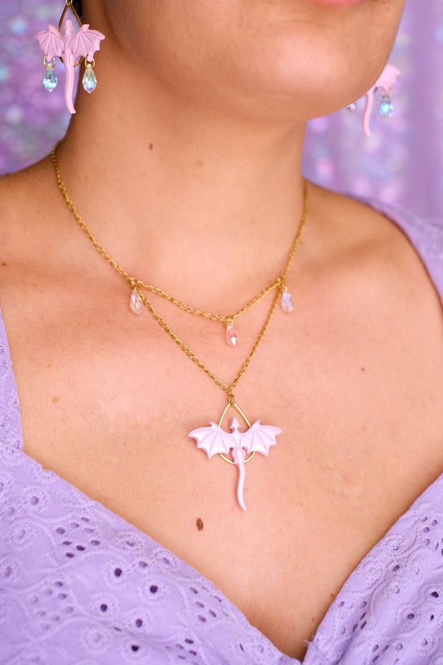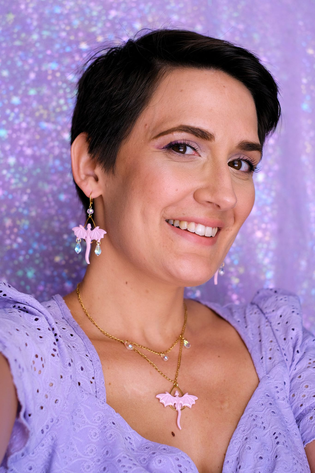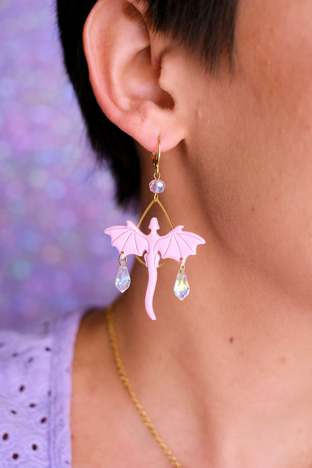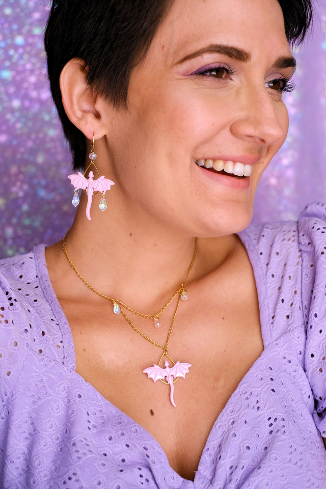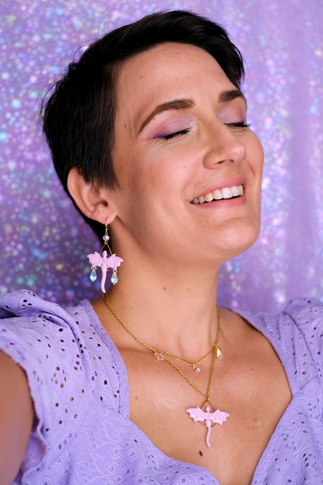 Hechos delicadamente a mano con arcilla polimérica y polvo de purpurina. Las partes doradas son todas de acero inoxidable bañado en oro. Las gotas son de cristal genuino.