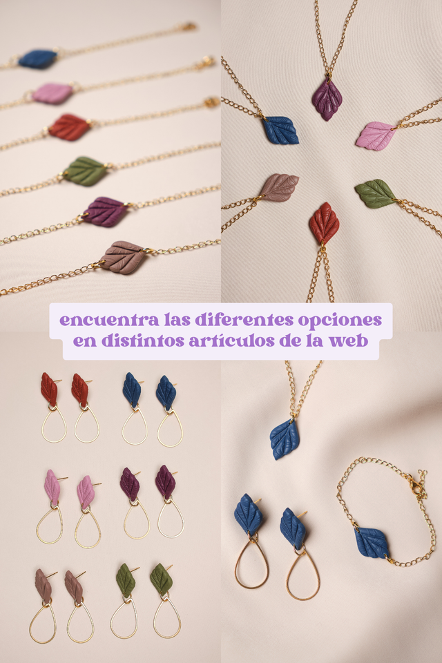 Opciones en varios colores para elegir. También disponibles en collares, pendientes o set completo en diferentes artículos de la web.
