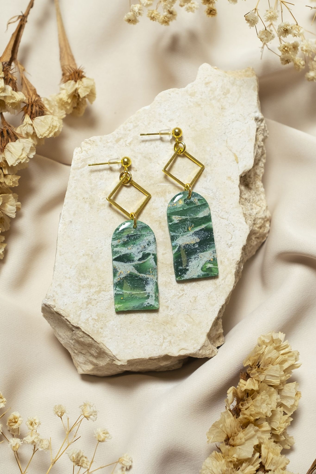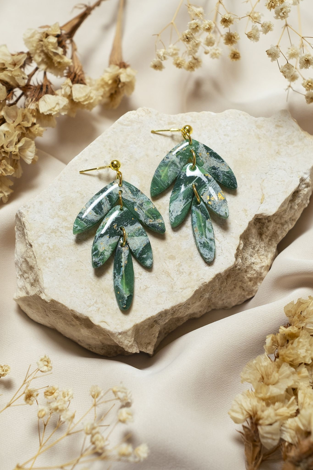 Handmade with polymer clay and assembled by hand. The gold parts are all plated stainless steel.
