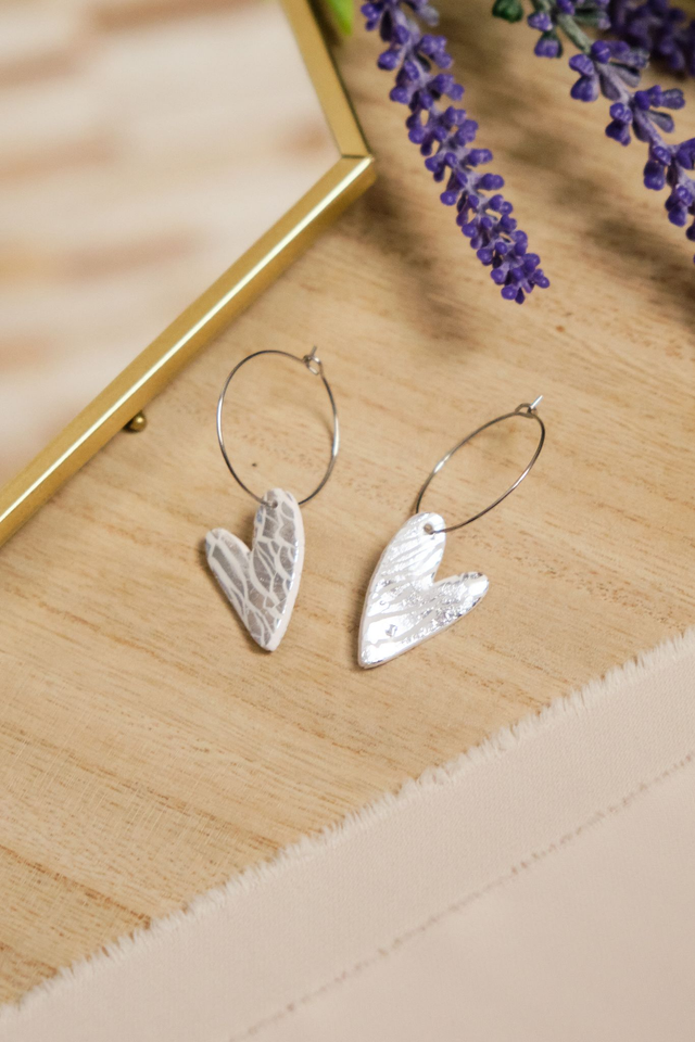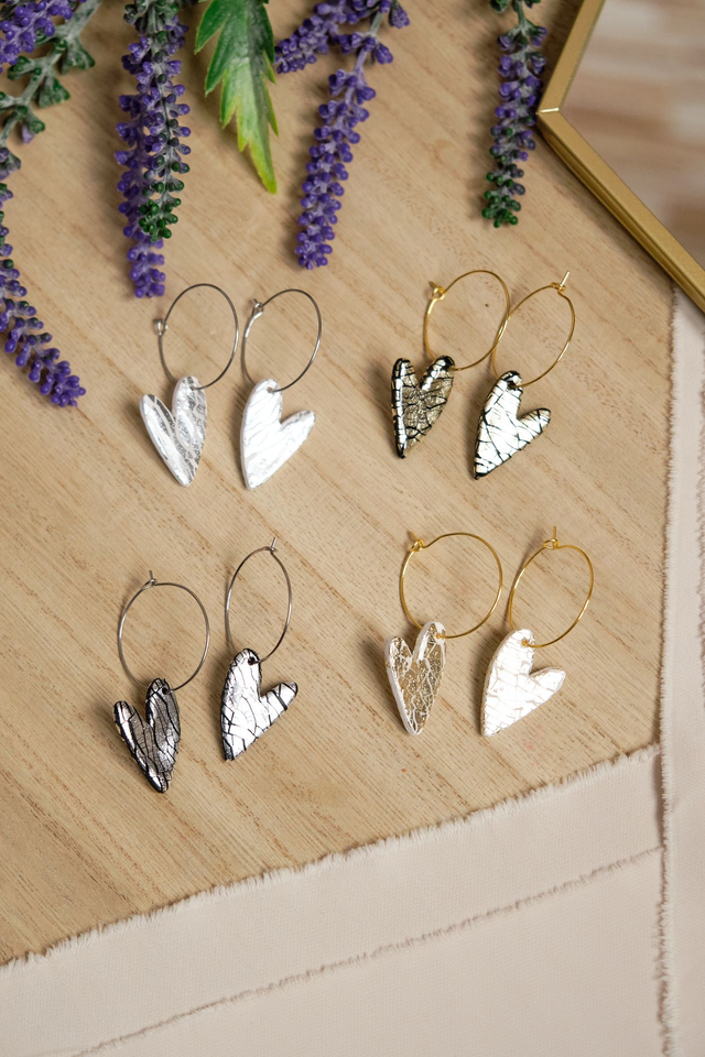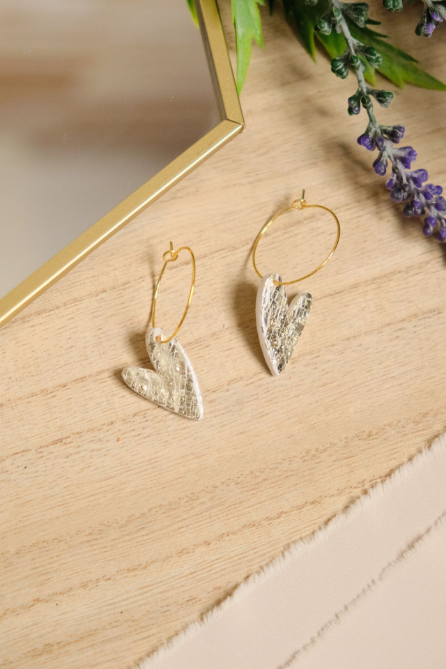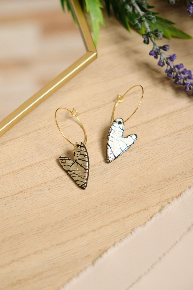 Handmade with polymer clay and silver/gold foil. The silver/gold hoops are all stainless steel/plated stainless steel.
