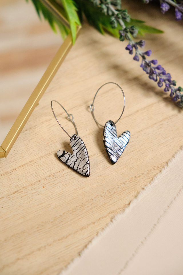 Hechos a mano con arcilla polimérica y papel de plata/oro. Los aros dorados/plateados son de acero inoxidable/acero inoxidable bañado.