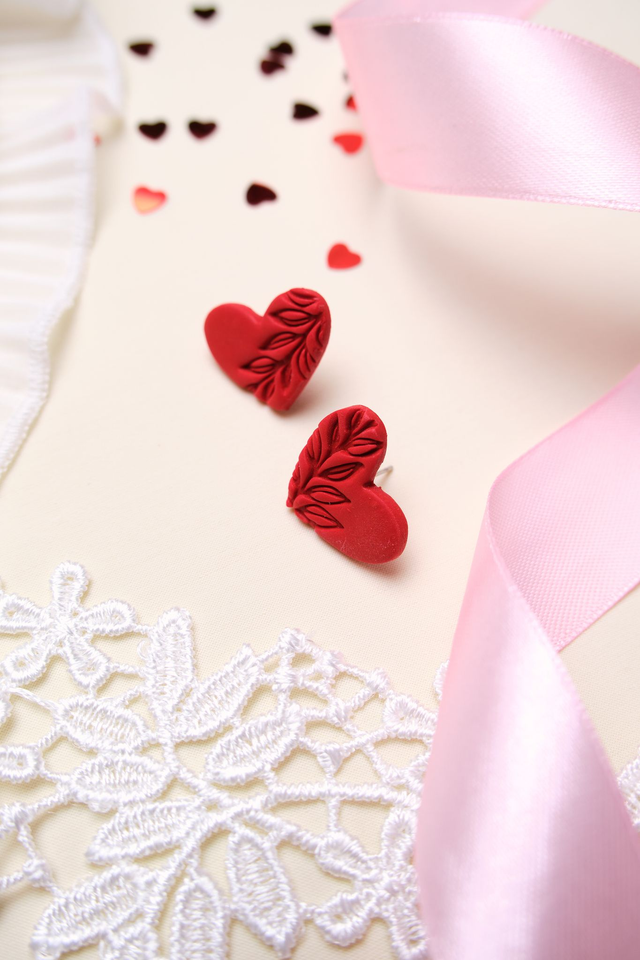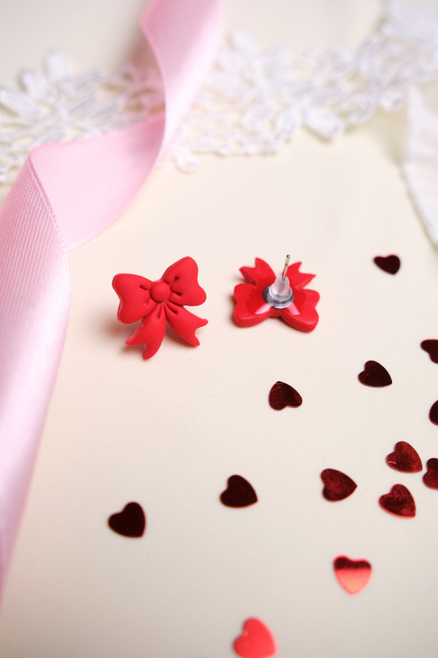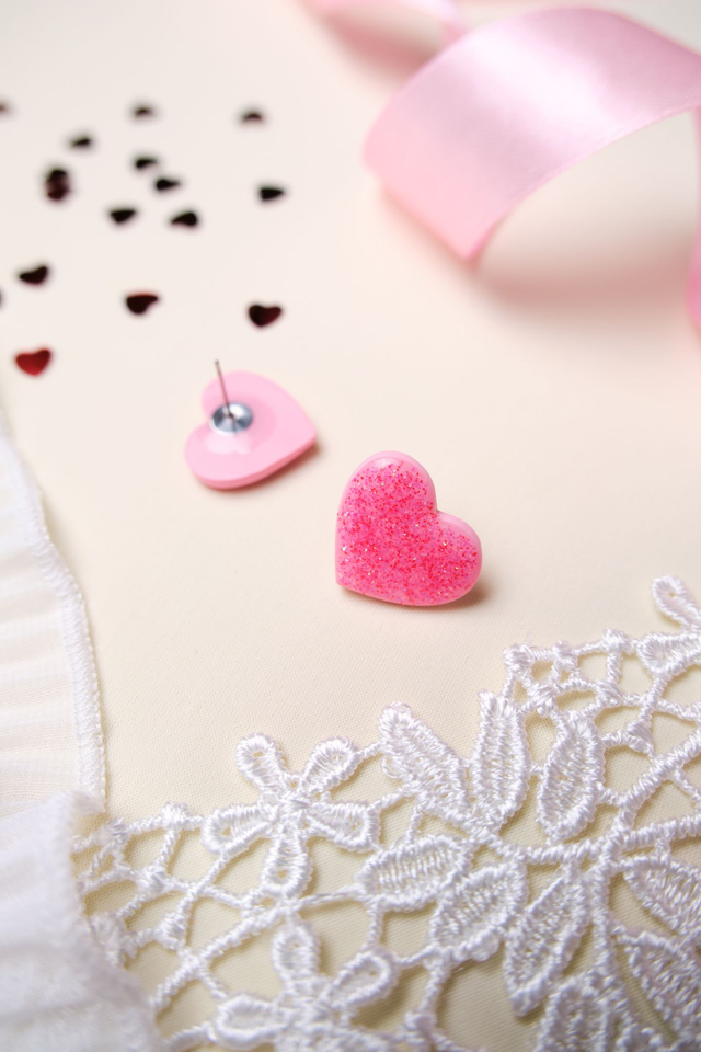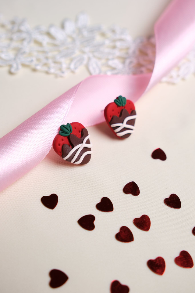 Stud earrings in different styles to choose from: chocolate strawberries, pink glitter hearts, red hearts, red bows and pink hearts with a hateful message... If romanticism isn't your thing. ;)