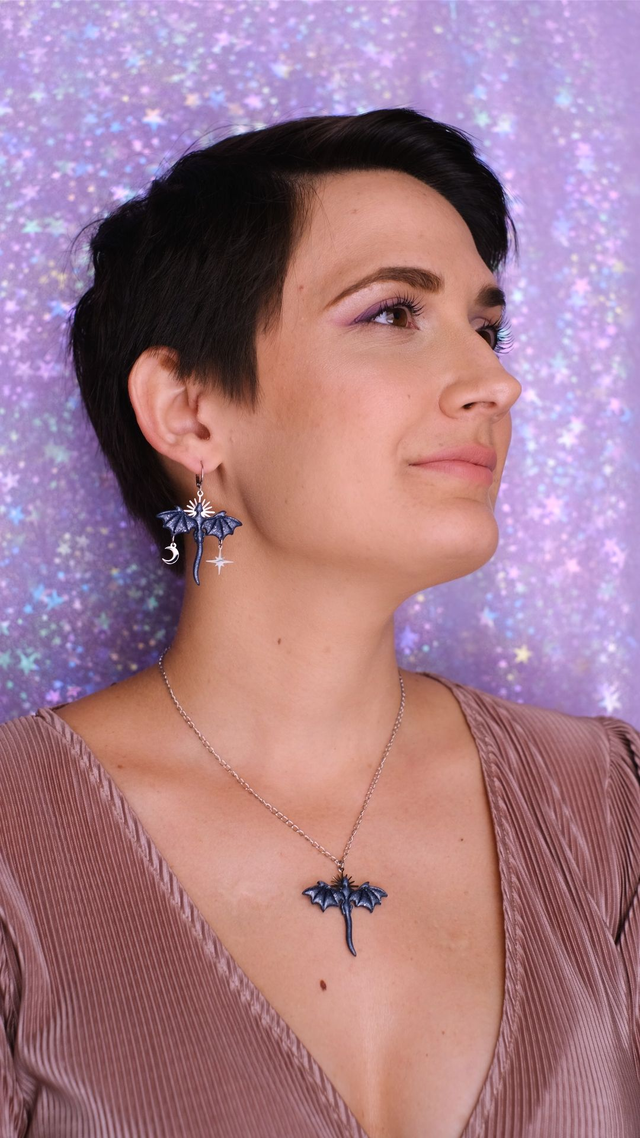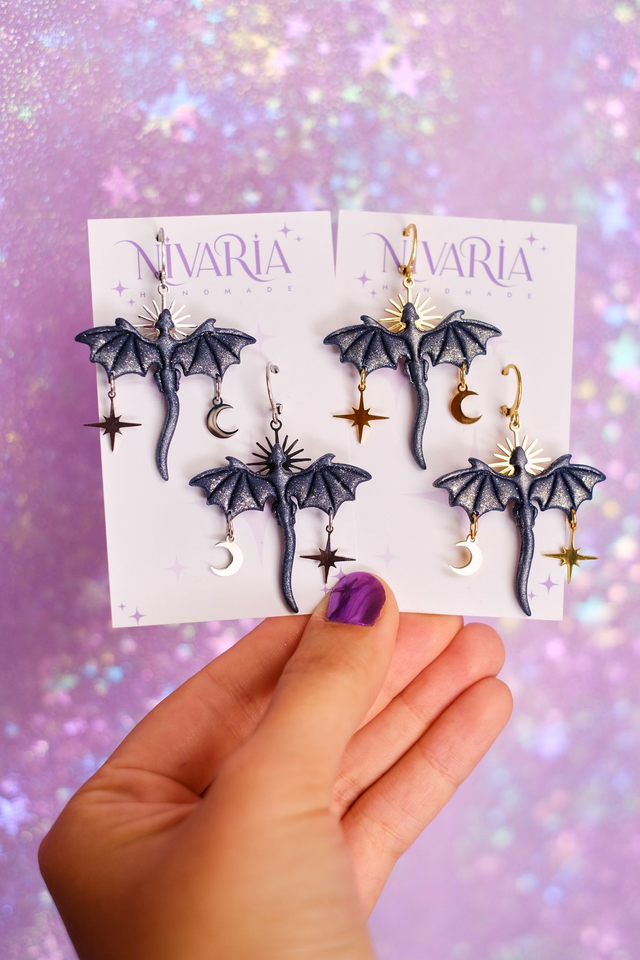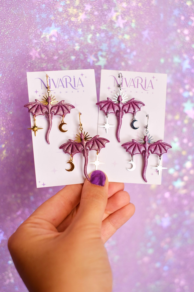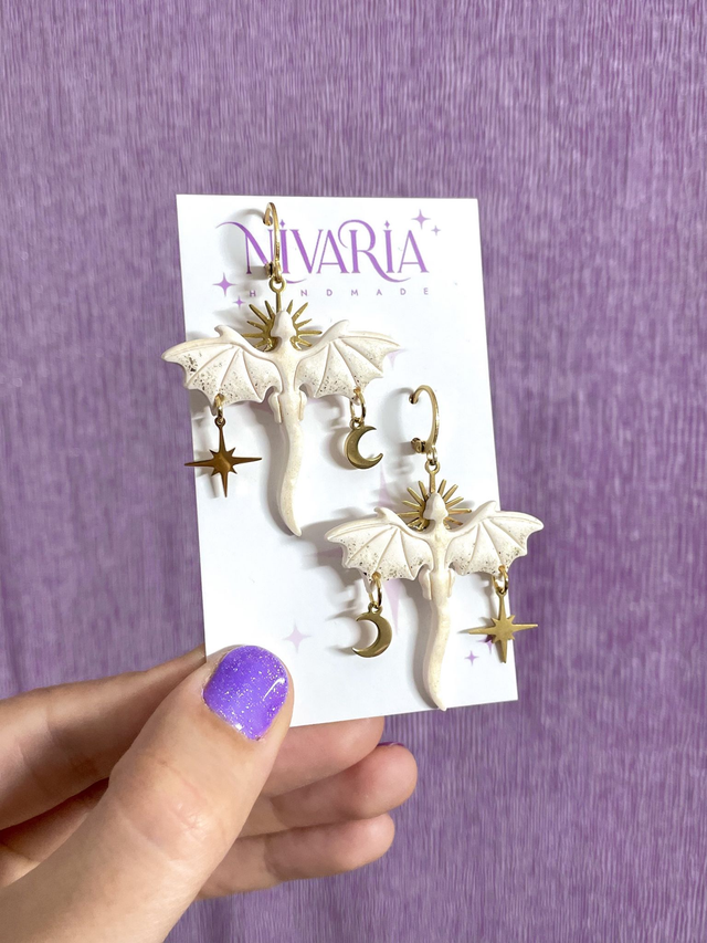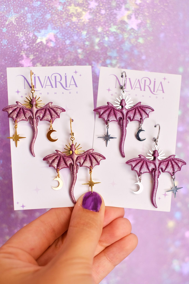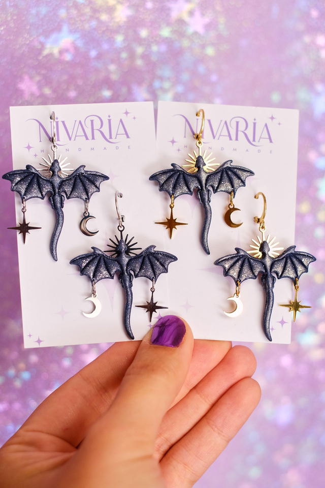 Pendientes de dragones con charms de sol, estrellas y lunas. El regalo perfecto para los amantes de la lectura y la fantasía .♥
