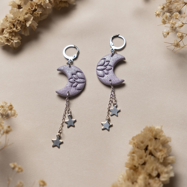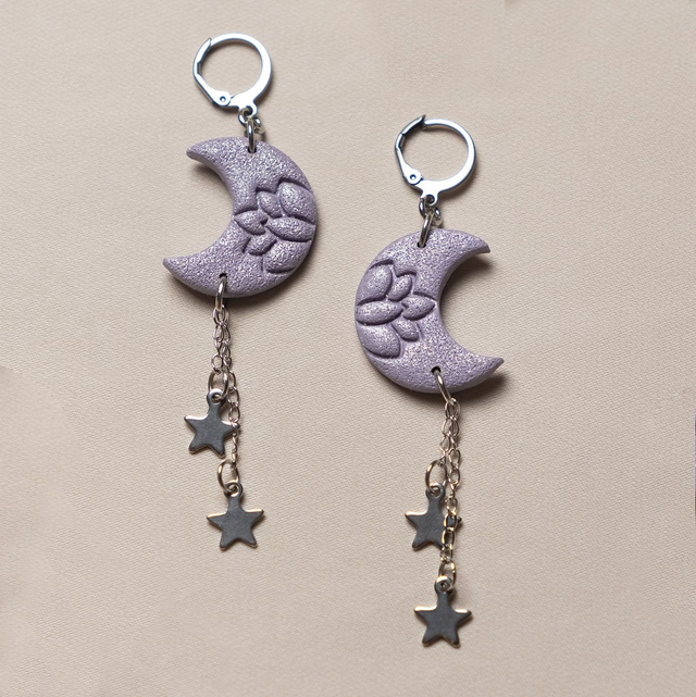 Pendientes de luna en malva con estrellas.