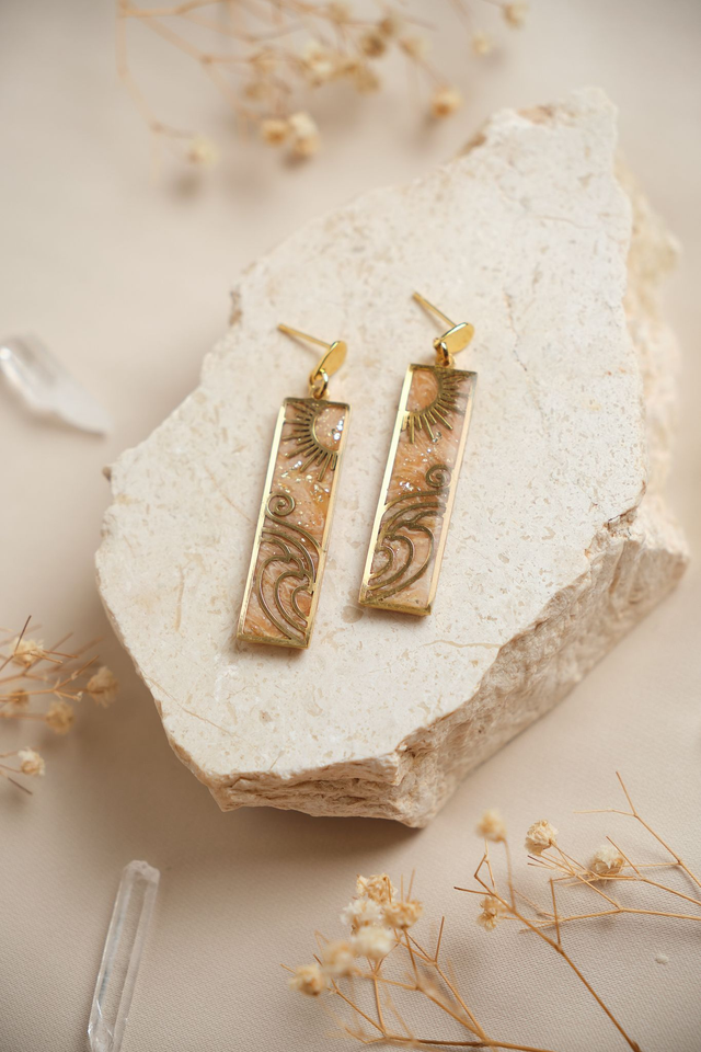 Pendientes de paisaje de sol y mar con un fondo tono miel.