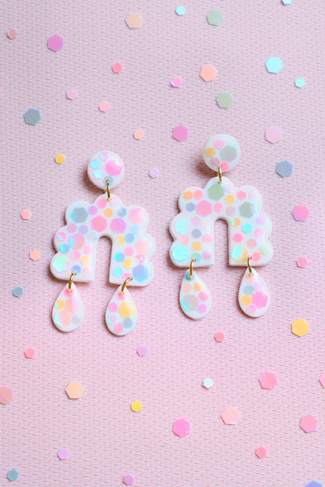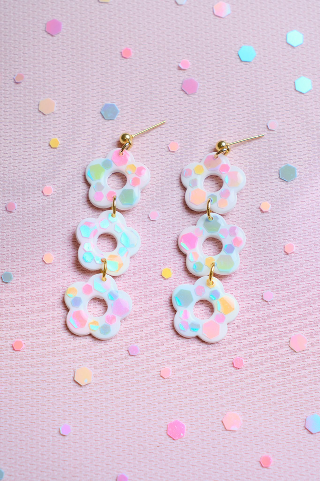 Iridescent earrings. Handmade with polymer clay, colorful sequins and resin.