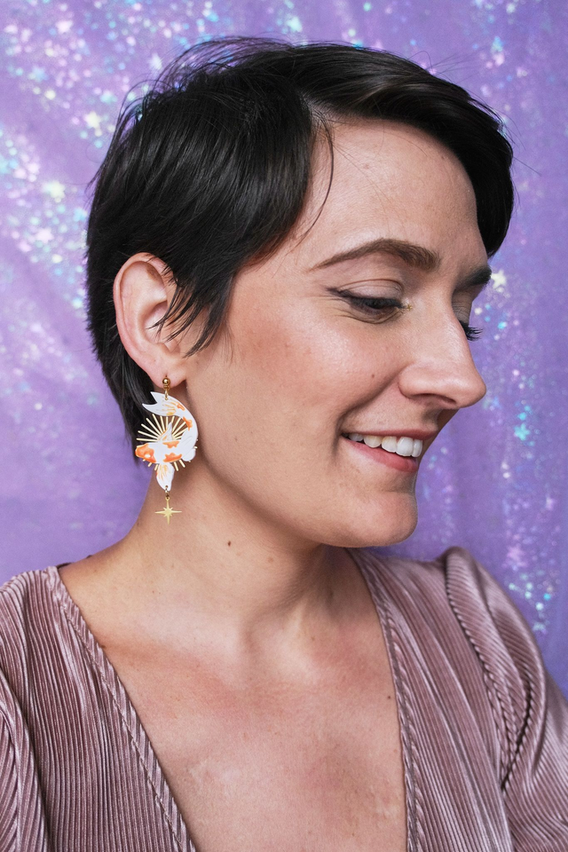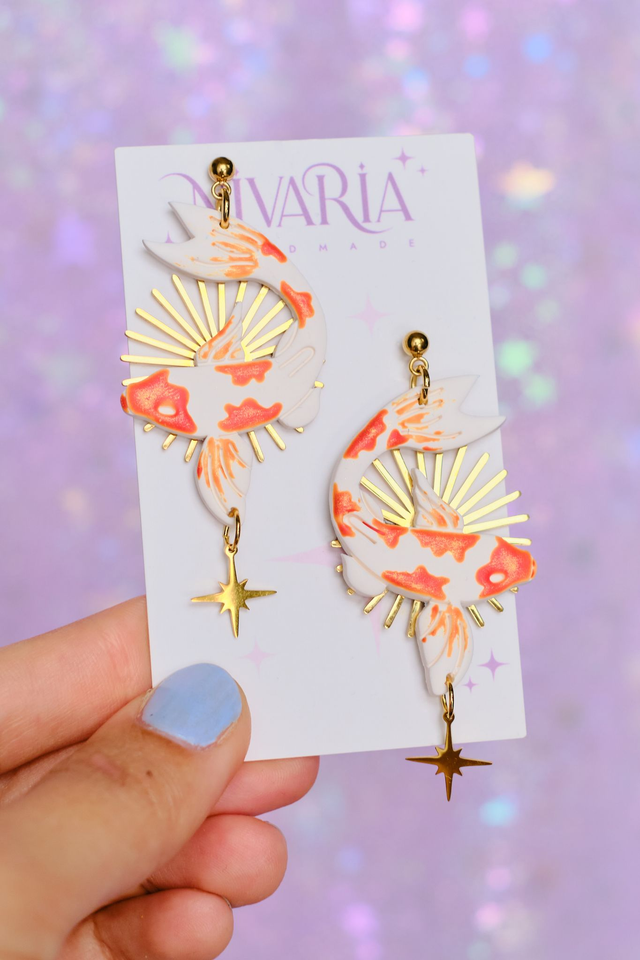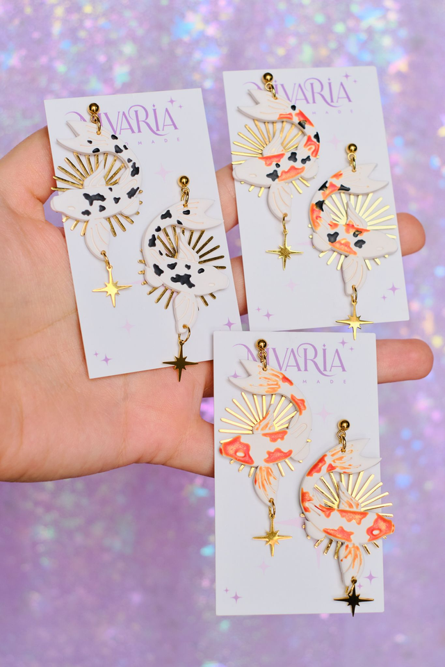 Celestial Koi carp earrings. Featuring handmade and hand painted Koi fish with a golden sun and star charm, three different color styles to choose from.