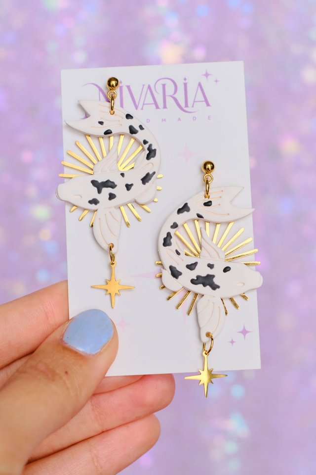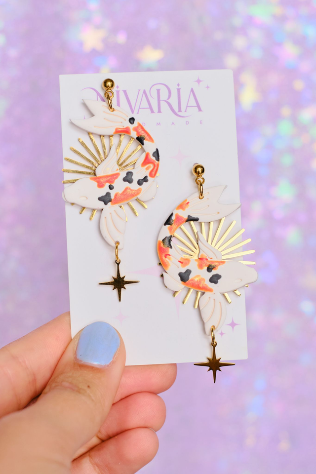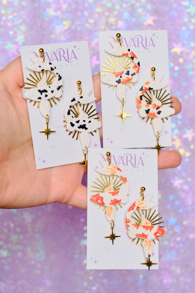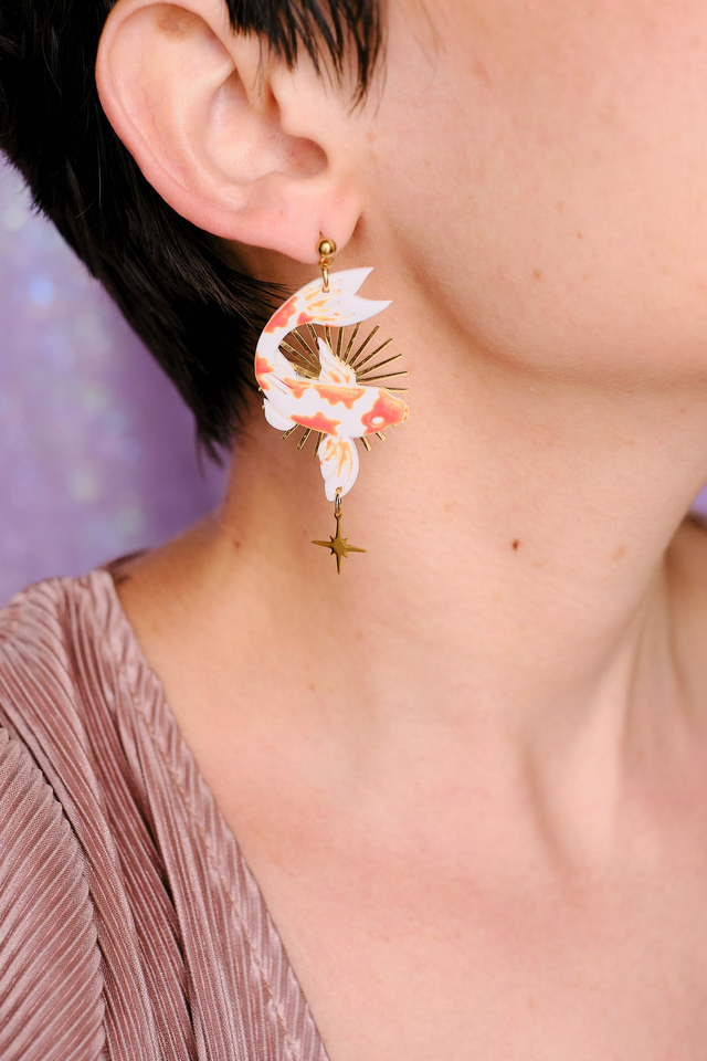 Celestial Koi carp earrings. Featuring handmade and hand painted Koi fish with a golden sun and star charm, three different color styles to choose from.