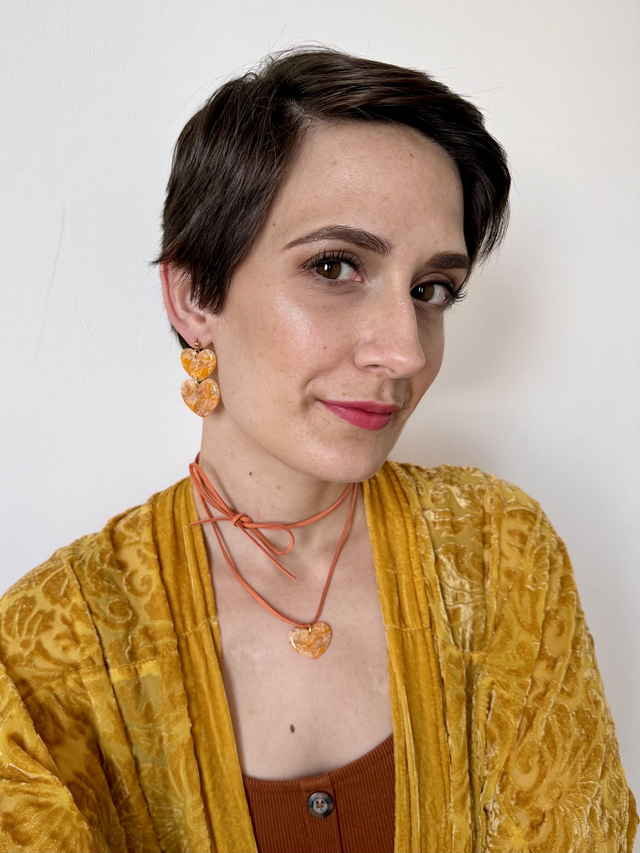Set de pendientes y collar tipo gargantilla de corazones naranjas en efecto mármol.
