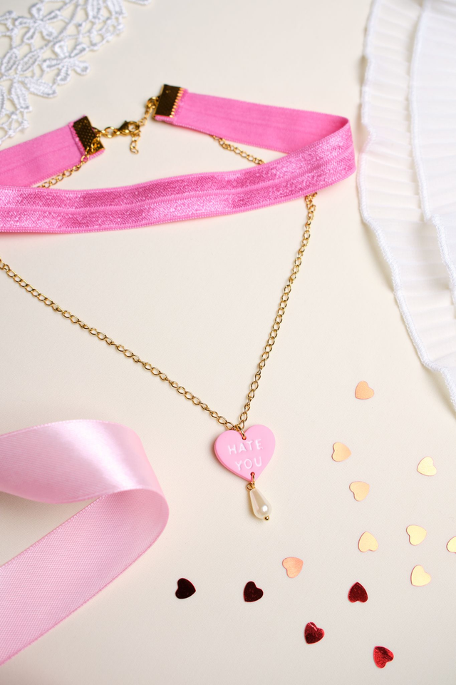 Earrings and choker necklace set of pink hearts with *slightly* violent messages. A jewelry set for a true hater.