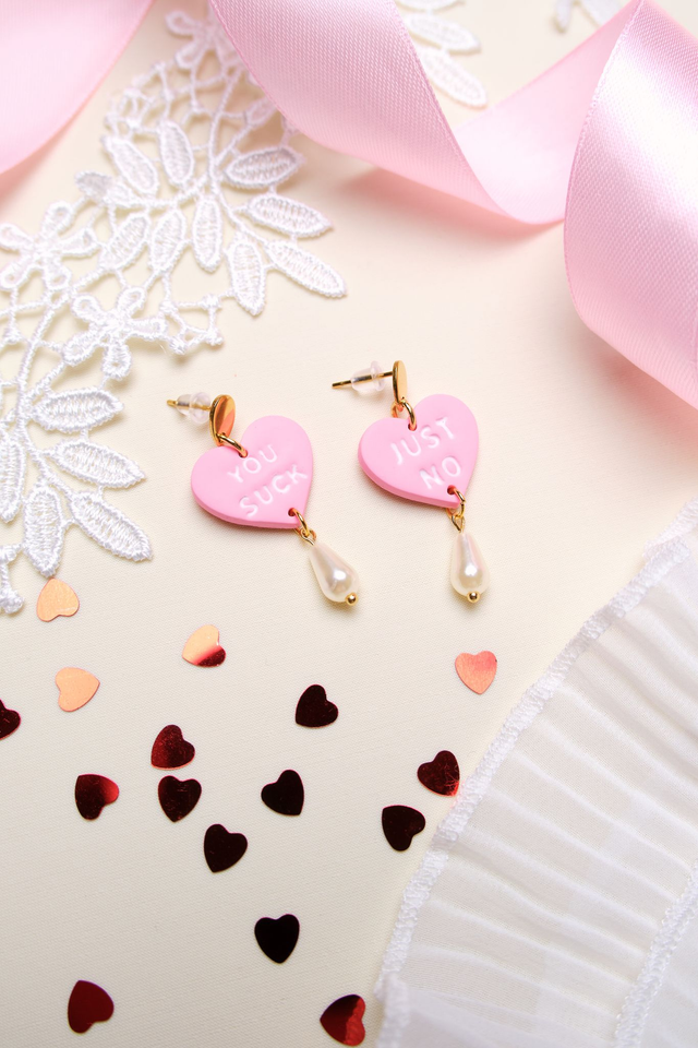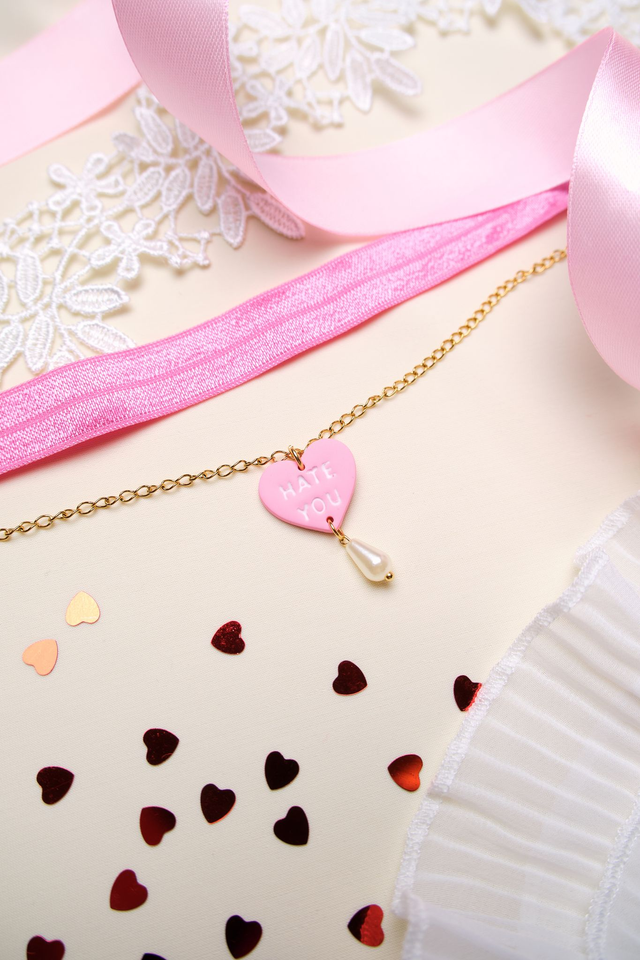 Set de pendientes y gargantilla de corazones rosas con mensajes *ligeramente* violentos. Un set para haters de manual.