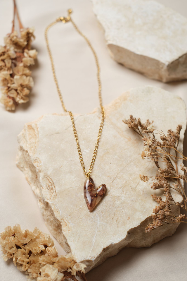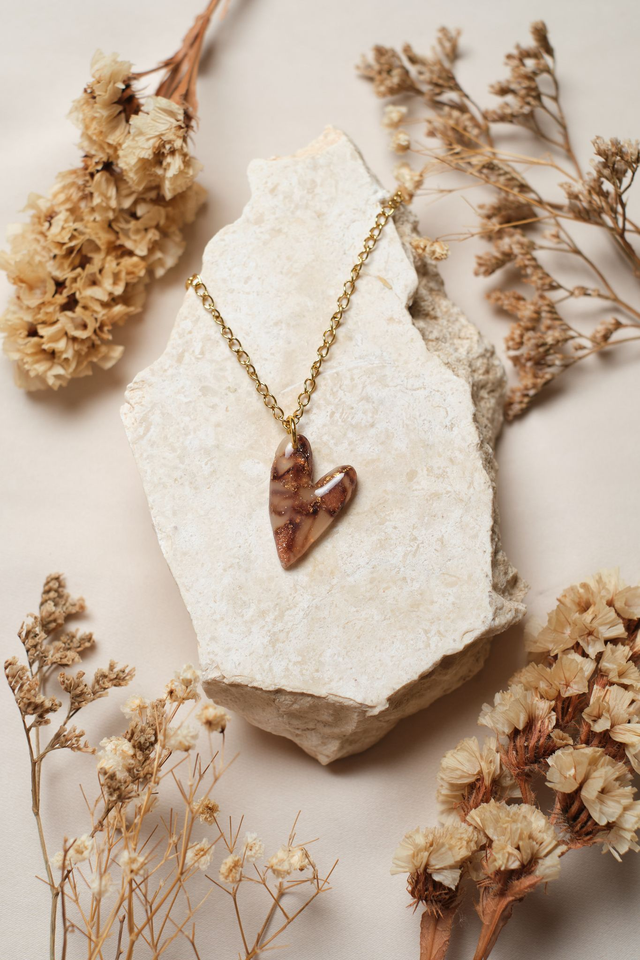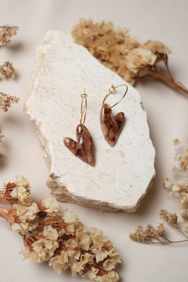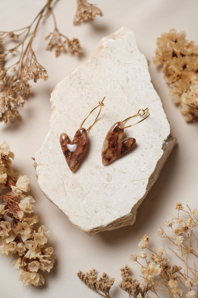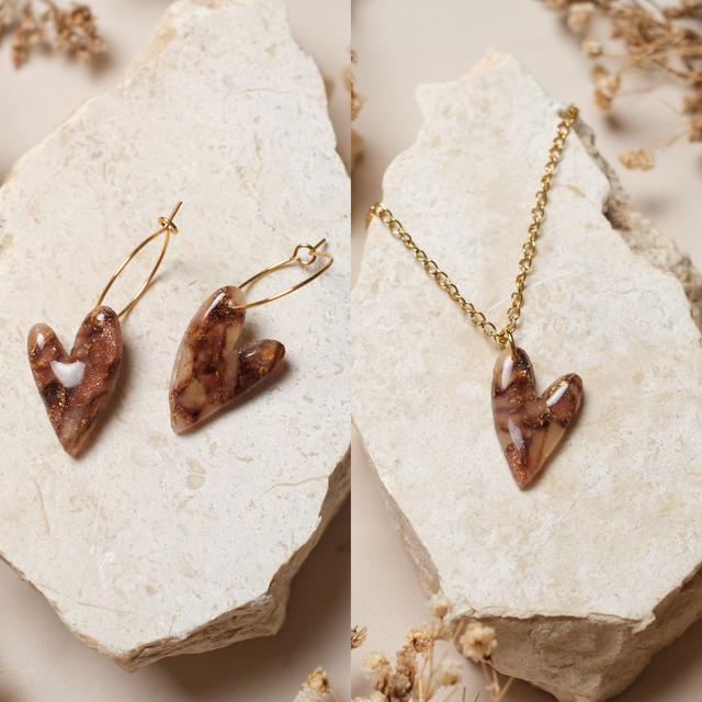 Heart earrings and necklace jewelry set in a brown marble effect.