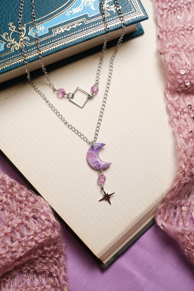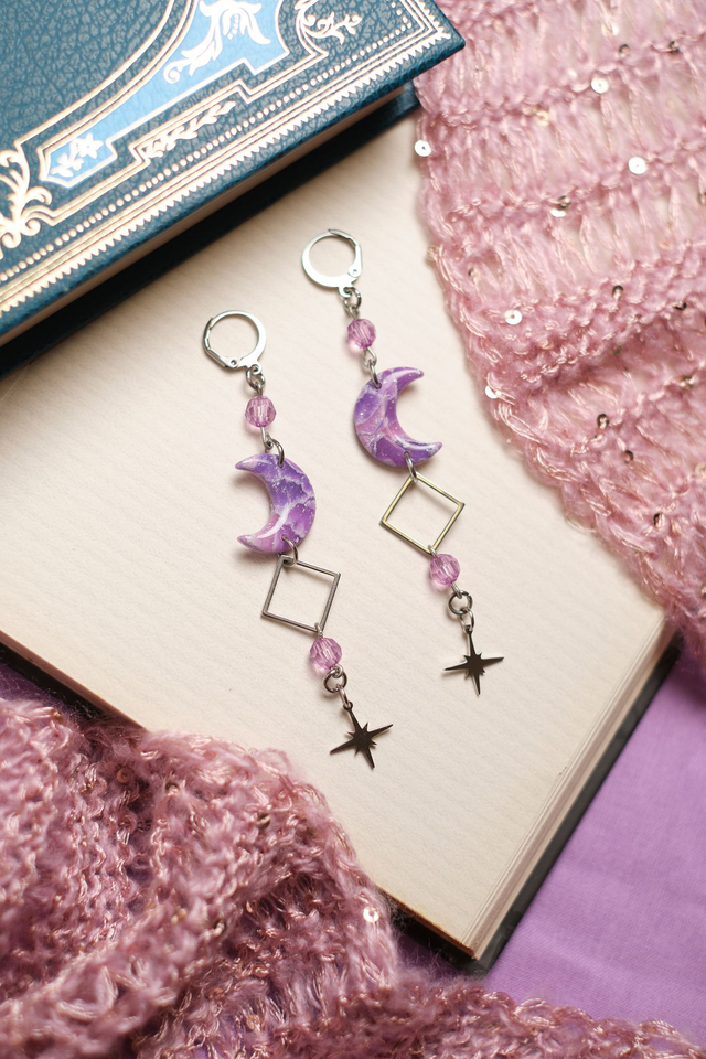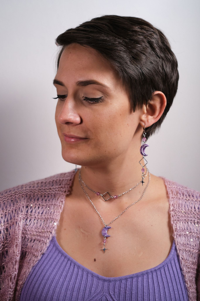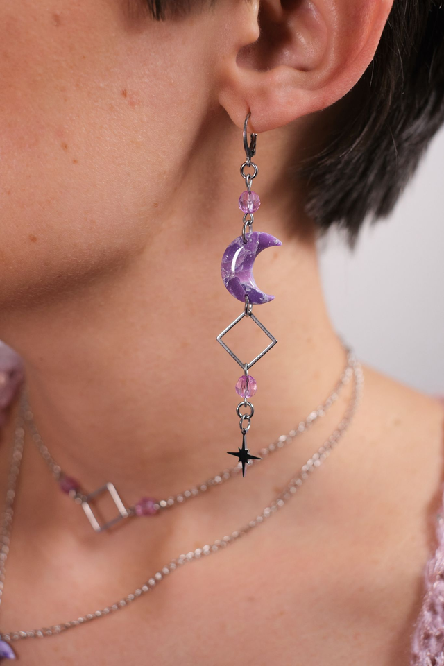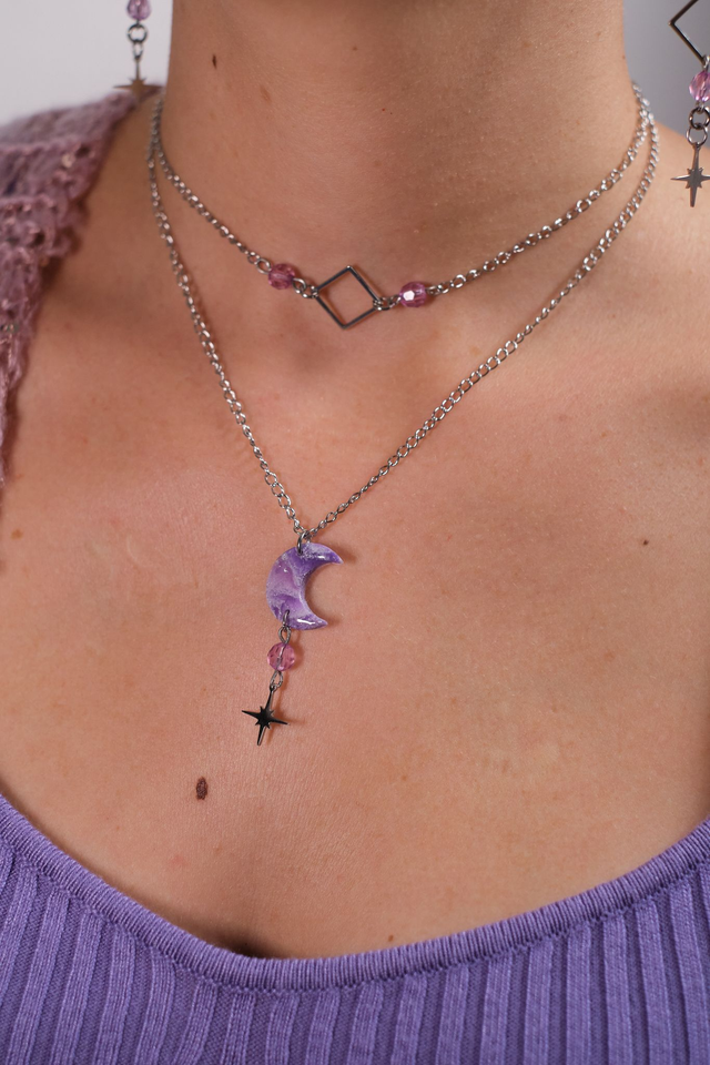 Set de pendientes y collar de lunas en efecto marmoleado malva.