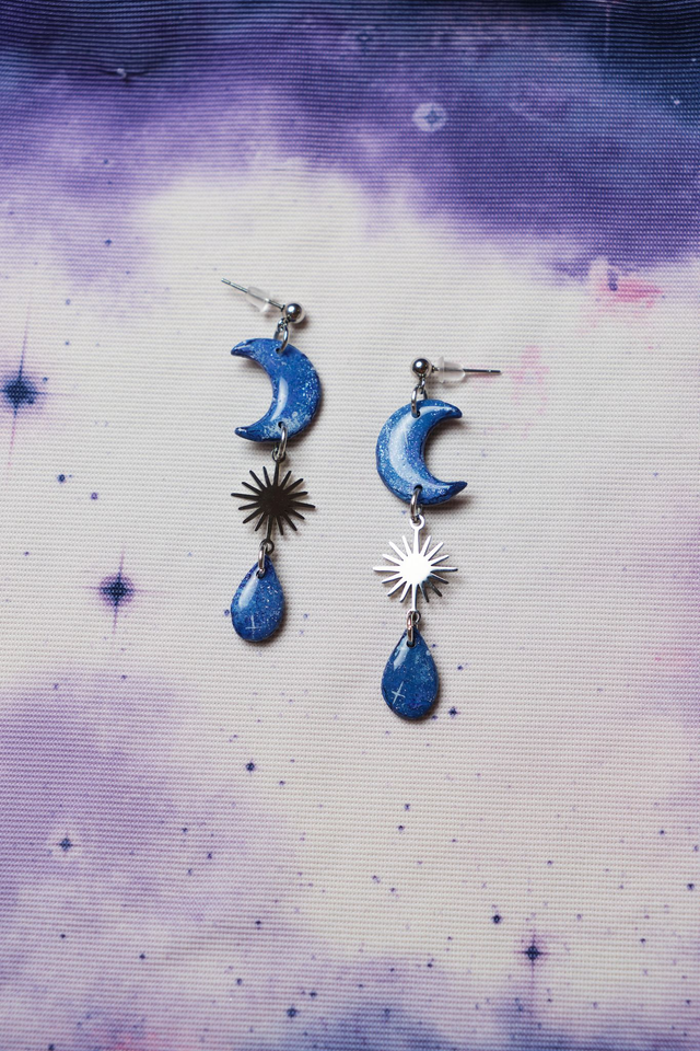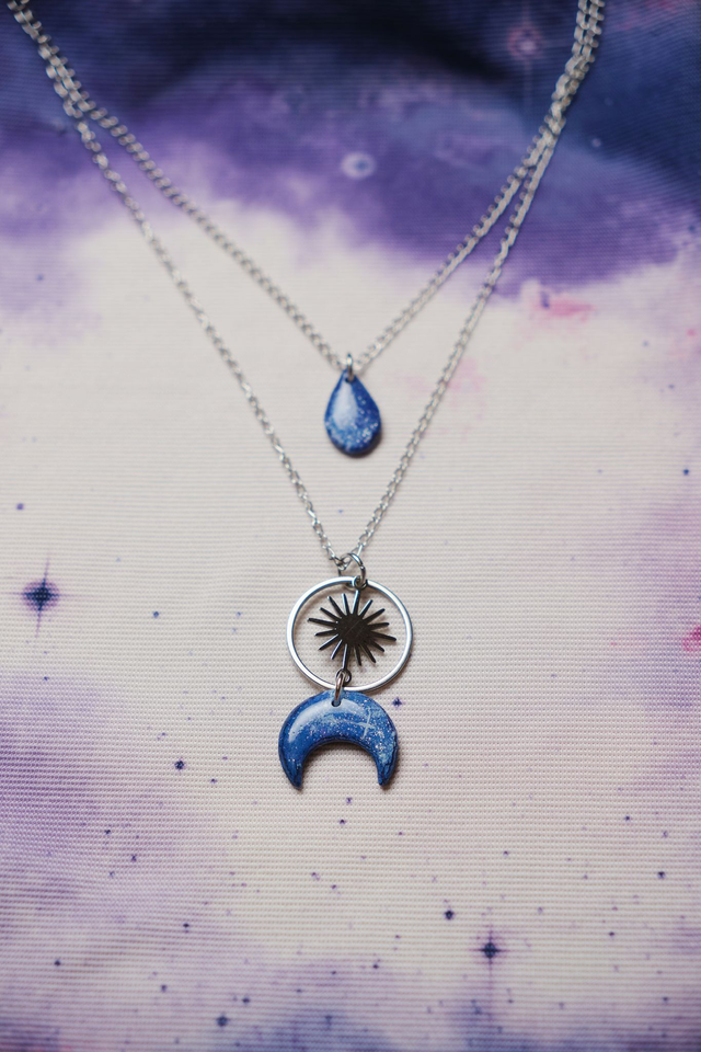Nebula moon and silver sun earrings and necklace jewelry set.