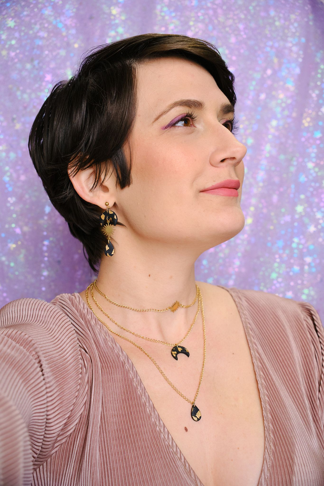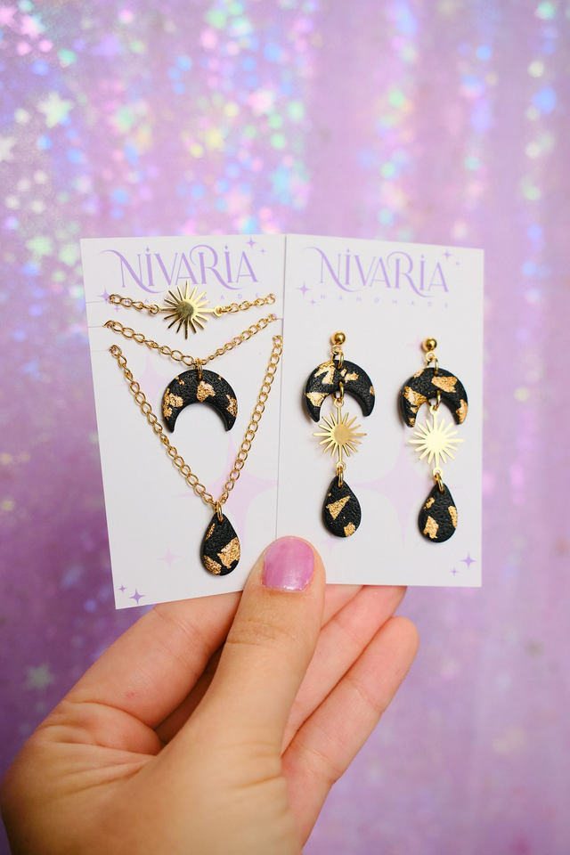 Set de pendientes y collar de luna negra y sol dorado. Inspiradas en mi tierra volcánica, Islas Canarias.