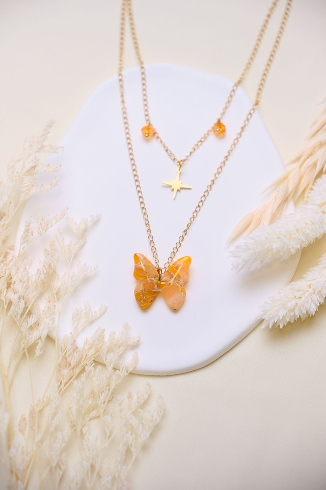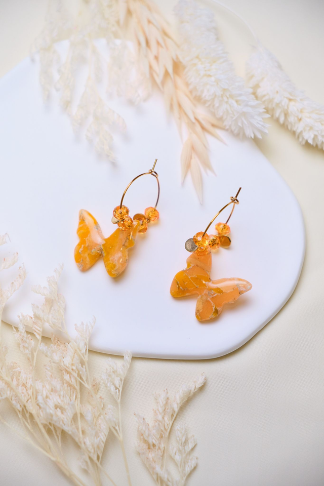 Set de pendientes y collar de mariposas naranjas en efecto mármol.